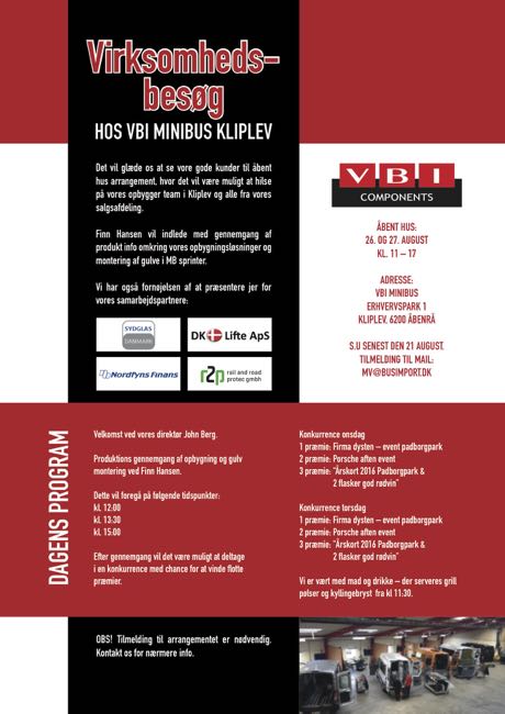 Af: RedaktionenVBI Minibus i Klivplev inviterer til åbenthus / virksomhedsbesøg 26. og 27. august i sine lokaler i Erhvervsparken i Kliplev.