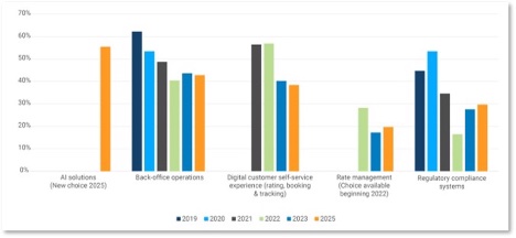 55 procent af respondenterne ser kunstig intelligens - AI - som deres vigtigste investeringsfokus de næste to år. Samtidig stiger andelen, der prioriterer prisstyringsløsninger (20 procent) eller compliance-løsninger (30 procent), i takt med at branchen står over for stadig mere komplekse regler.
