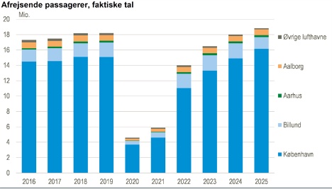 Sidste år rejste samlet 18.835.000 passagerer fra en offentlig dansk lufthavn. Det var det hidtil højeste antal og en stigning på 5 procent i forhold til 2024, hvor antallet af afrejsende flypassagerer var på 17.994.000. Det fremgår af den seneste statistik fra Danmarks Statistik over afrejsende passagerer fra offentlige danske lufthavne