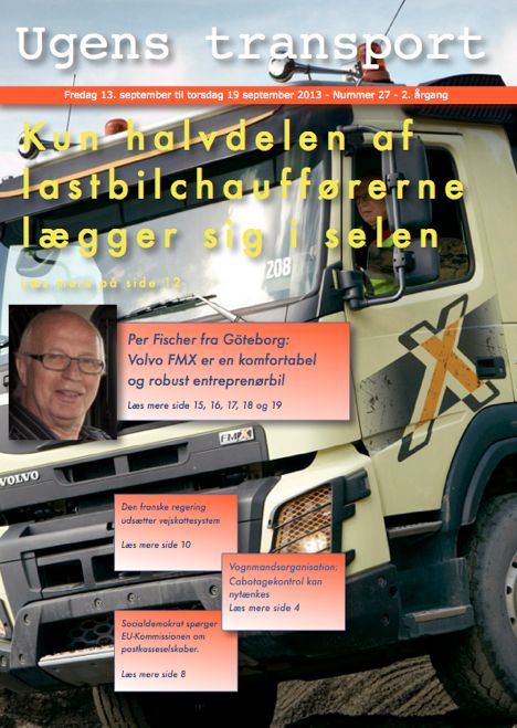 Af: RedaktionenI denne udgave af Ugens transport har vi en reportage fra Göteborg om den nye Volvo FMX, artikler om postkasseselskaber, cabotagekørsel, vejskat i Frankrig og konkurser
