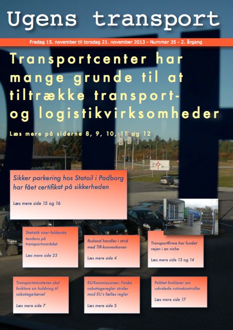 Af: RedaktionenI denne udgave af Ugens transport - nummer 35 - har vi en større artikelserie om Hirtshals Transport Center, der har 240.000 kvadratmeter erhvervsområde liggende klar til at danne grundlag for vækst og udvikling. Vi skriver også om sikker parkering i Padborg, udvikling på transportområdet, TIR-situationen i Rusland, cabotage og om et firma, der har fundet Vejen i en niche