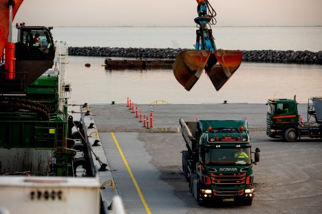 Med i lasten på »Aasvik« lå omkring 7.000 ton granitskærver fra Norge, der skal bruges til at etablere arbejdsveje på byggepladsen. »Aasvik« vil snart blive efterfulgt af hundredevis af andre skibe. Faktisk bliver arbejdshavnen på 500.000 kvadratmeter én af Danmarks travle havne. Et nyt fragtskib forventes at ankomme til byggepladsen cirka hver tredje dag.