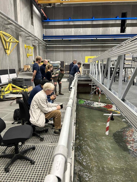 I bølgebassinet strømmer voldsomme bølger ind over bygningsværket, mens repræsentanter fra universitetet og havnen roligt ser til. I bassinet simuleres bølgeforhold, der svarer til alt fra gennemsnitlige vejrforhold til den værste storm set i hundrede år.