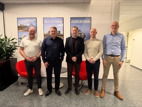 Ole Gantzhorn Pedersen - Country Manager, Posta, (tv) Edvard S. Remberg - CEO, Posta, Jan Dam Poulsen - Regional Senior Vice President, Transport & Logistics, Nordics, Blue Water, Dennis Sigtenborg Bruun - Head of Business Development, North Atlantic, Blue Water og Kenneth Skovbjerg Pedersen - Director, North Atlantic, Blue Water. (Foto: Blue Water)